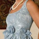 A chic ice-blue denim mini with foil-textured finish, playful peplum flare, and twin bow detailing—a bold yet polished look.