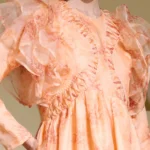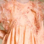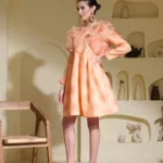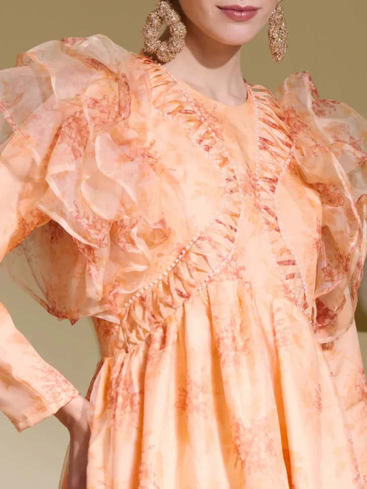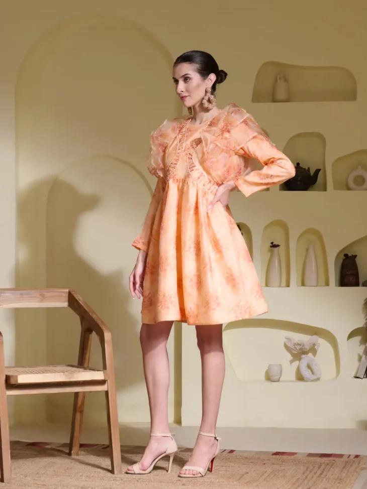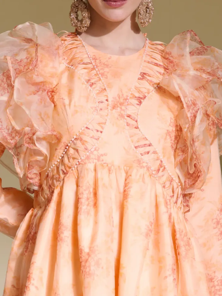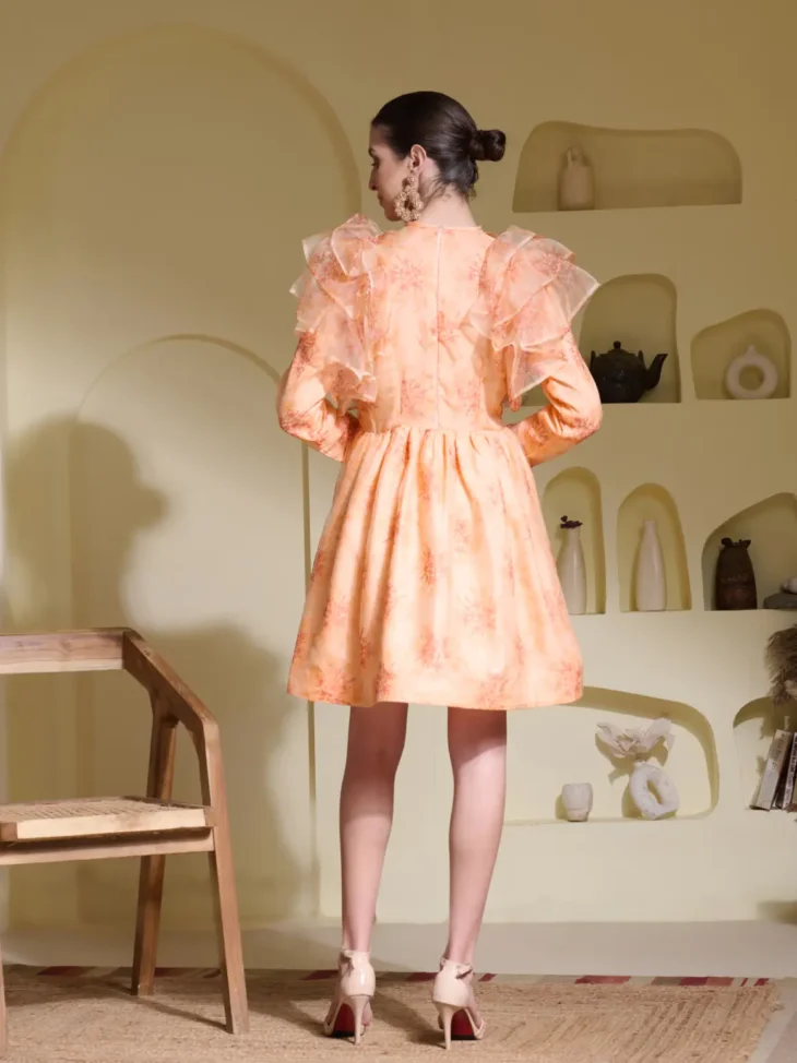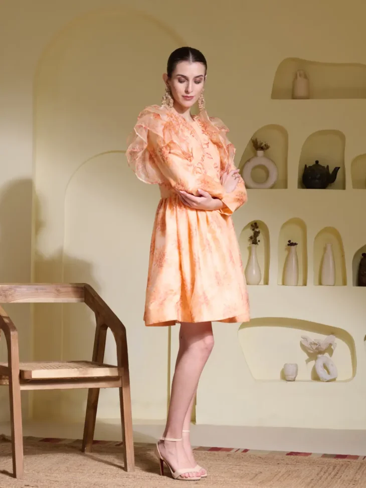 A soft orange organza mini dress with sculpted ruffles and crisscross front detail, elevated with delicate beadwork for a whimsical yet refined look.
