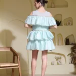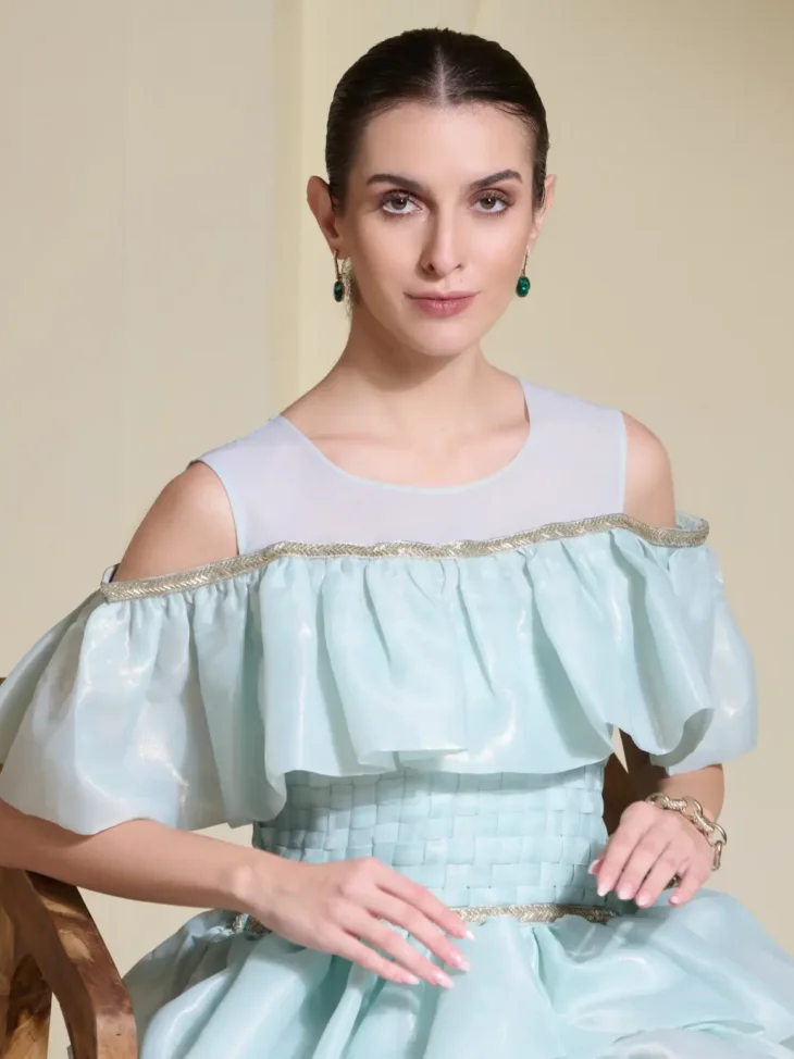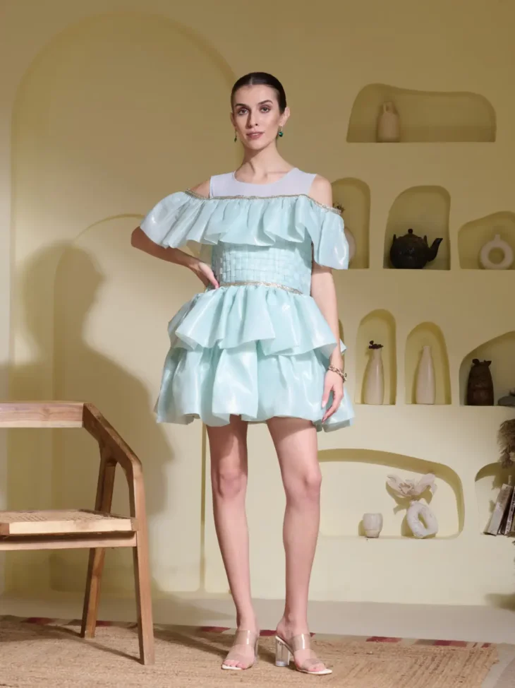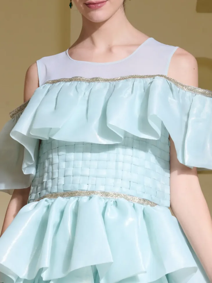 A playful mini dress in glass organza with dramatic layered ruffles, featuring a basket-woven bodice and delicate lace trim. Finished with a stretchable net neckline for added comfort and charm—fun, feminine, and full of texture