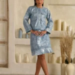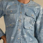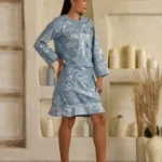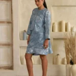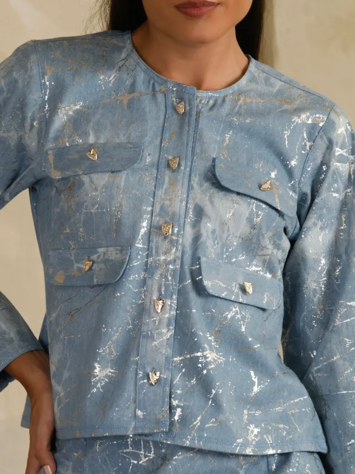 A structured co-ord set in foil-finish denim, featuring smart utility pockets, elegant buttons, and a subtle flared hemline for a chic twist.