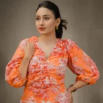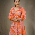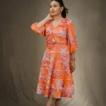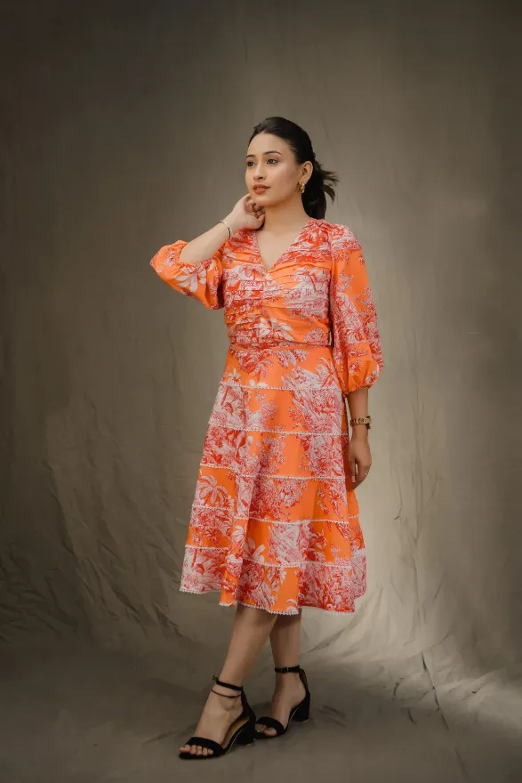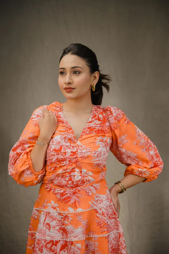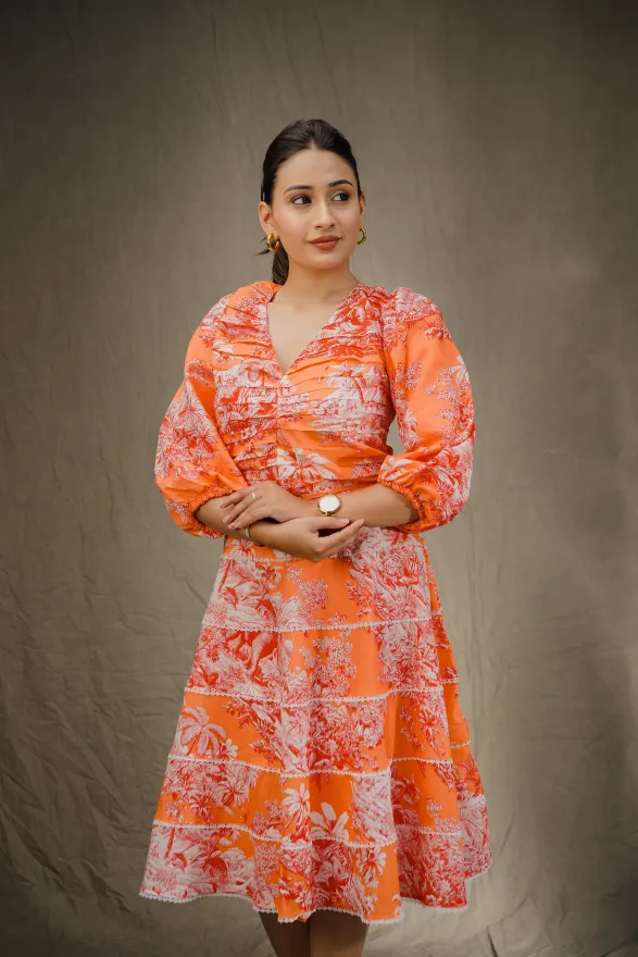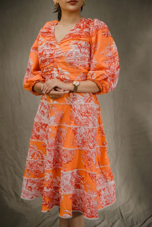 This dress features an in-house designed print in orange-reddish and white, showcasing jungle motifs. It has puff sleeves with elastic hems and a pleated bodice for a structured yet comfortable fit. The dress includes lace detailing on every panel, enhancing its elegance, and a nice flare look that adds a graceful flow.