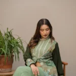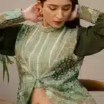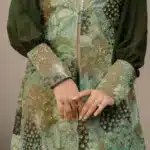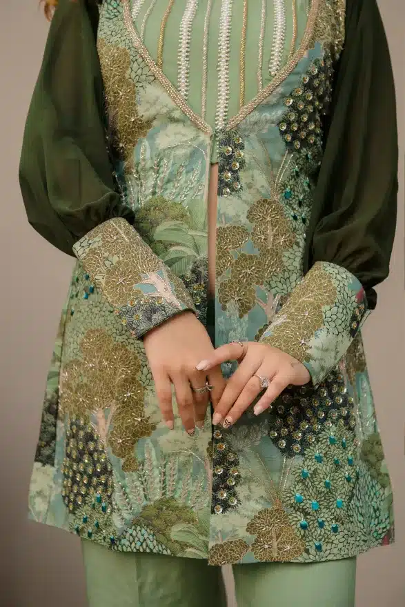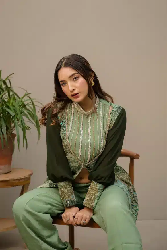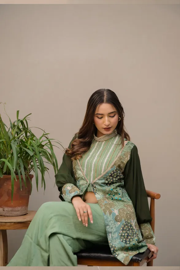 A sophisticated 3-piece set featuring a crepe bustier, elegant crepe pants, and a jacket with an in-house designed print, enhanced by georgette sleeves and printed fabric cuffs.