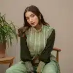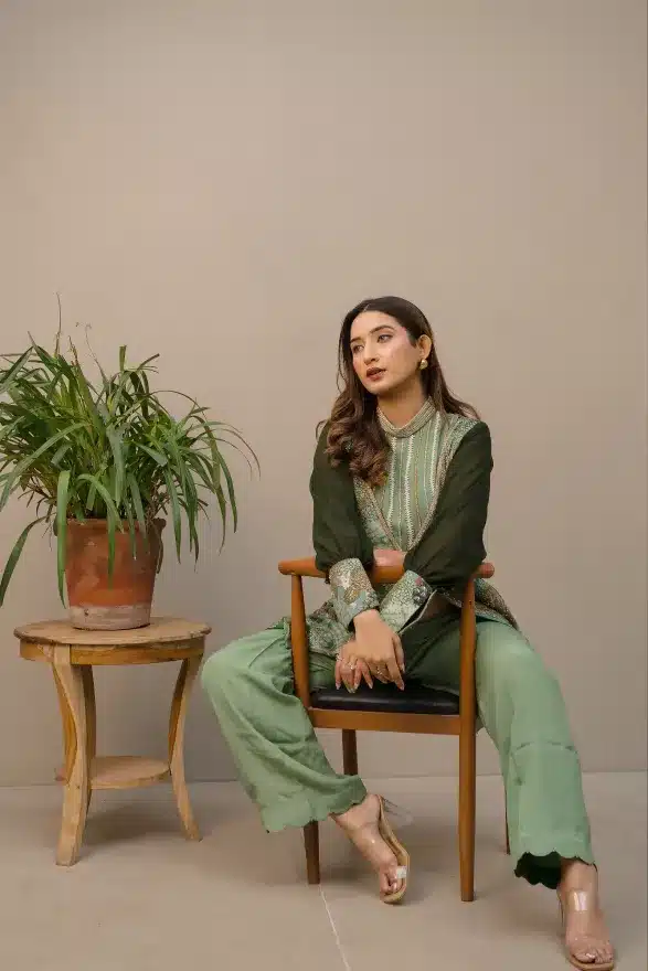 • Detailing: The jacket boasts detailed embroidery with unique designer sequin work, katdana, and small rhinestones, adding a luxurious embellishment. The bustier showcases a striking pattern of loaded lines with beads and katdana, exuding a royal feel with its regal silhouette. The pants feature an elegant design with scalping and small crystals for a refined touch.