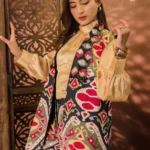 • Colour: Multi-colour abstract print with bold red, green, and ivory accents on a dark base