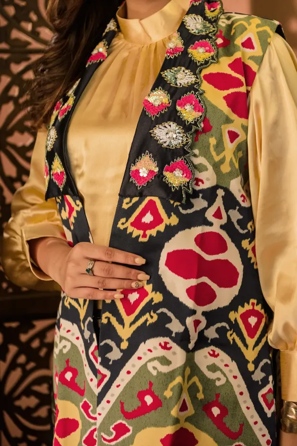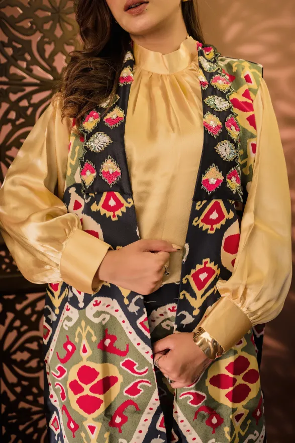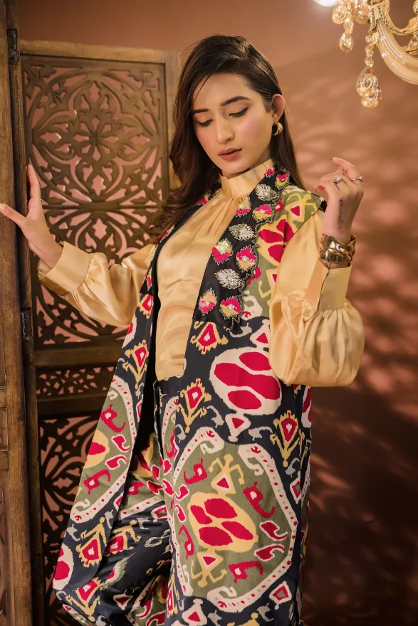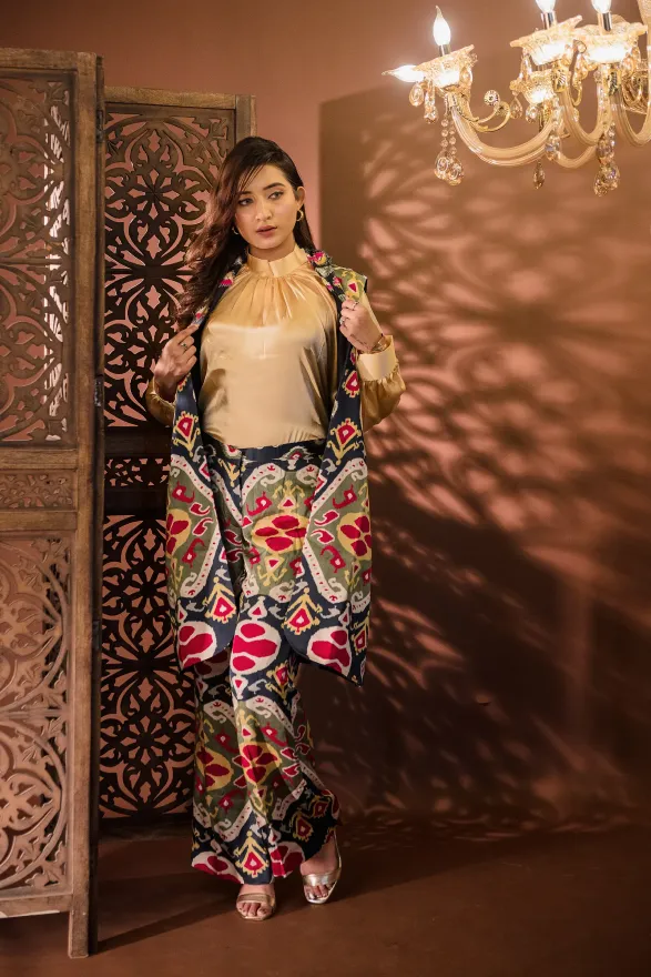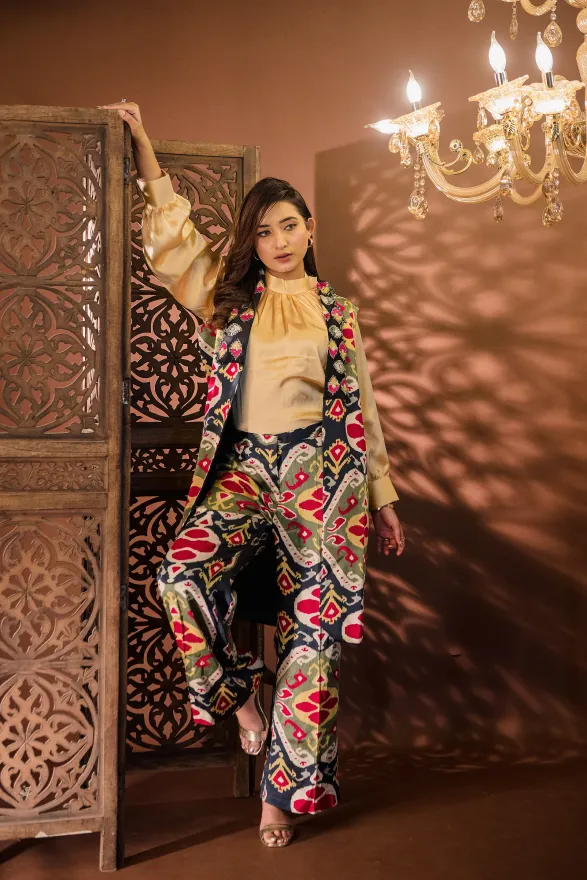 • Straight-fit pants with a longline sleeveless jacket