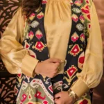 • Paired with a solid satin blouse in soft golden beige