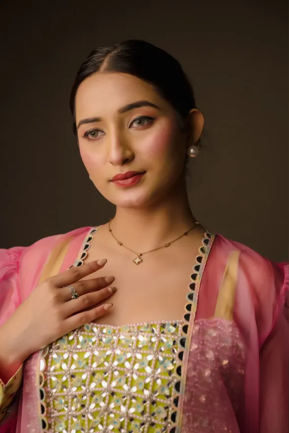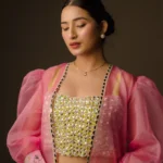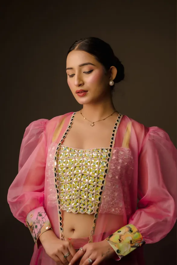 • Bustier: Neon crepe base with modern embroidery, featuring 3D petals, crystals, and beadwork in pastel shades