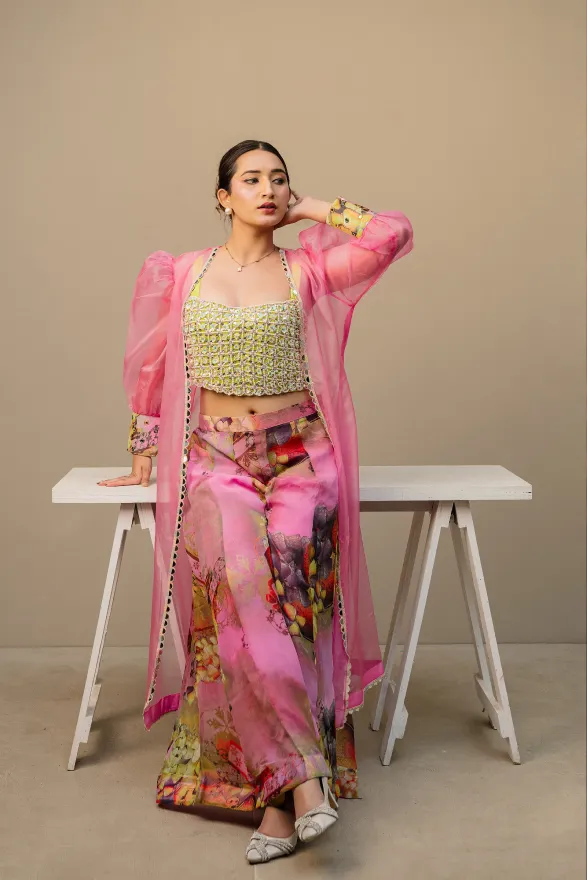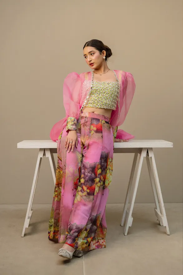 MAMA SAID CHIC Pink Embroidered Bustier with Organza Shrug & Flared Pants