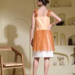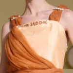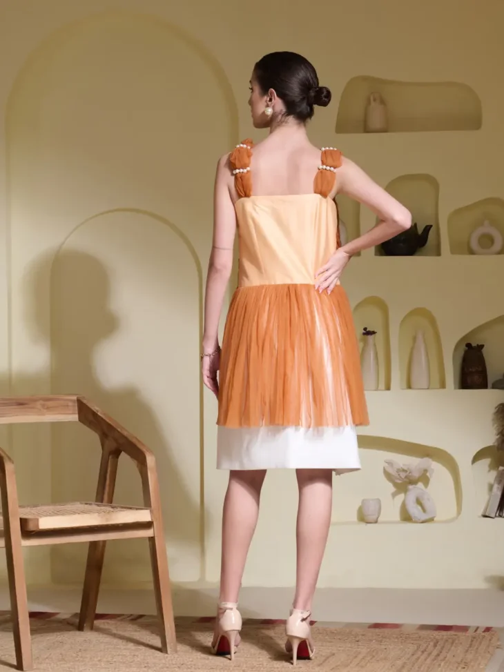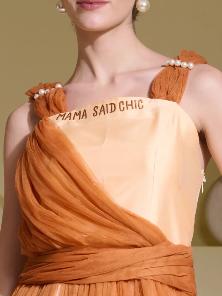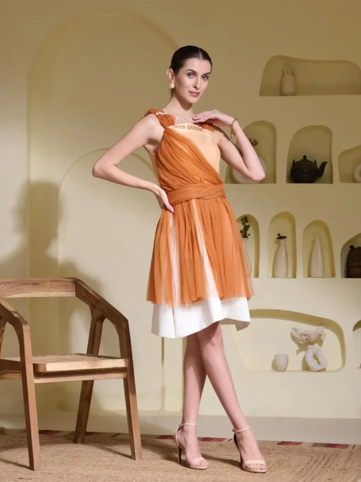 A statement mini dress in taffeta silk with a soft net drape, artfully wrapped for a Grecian-inspired look. Personalized with machine embroidery on the neckline—add your own name for a truly custom touch.