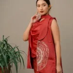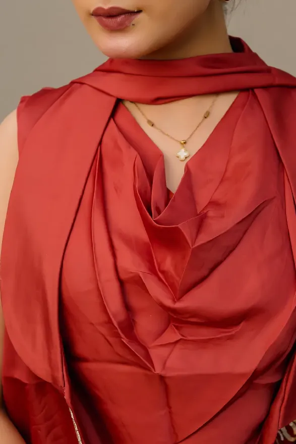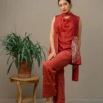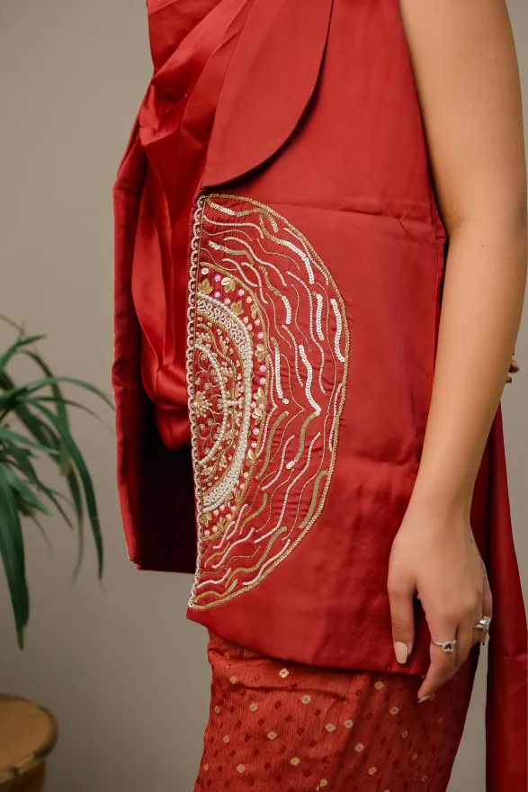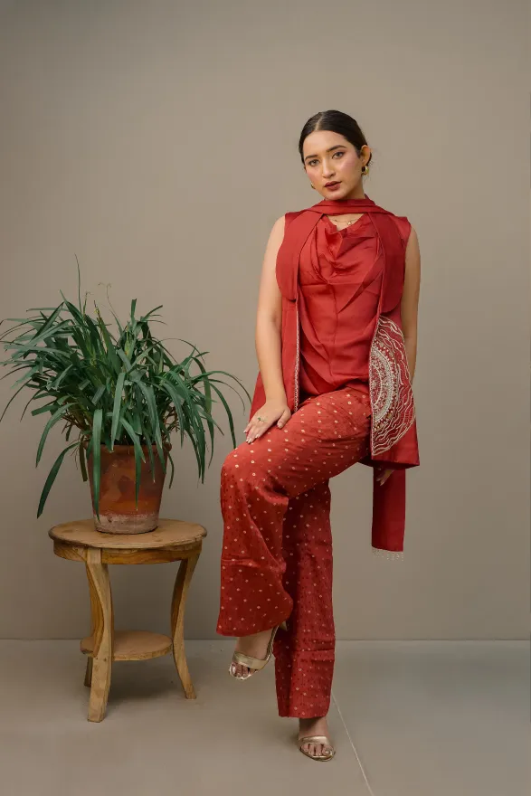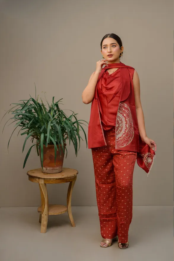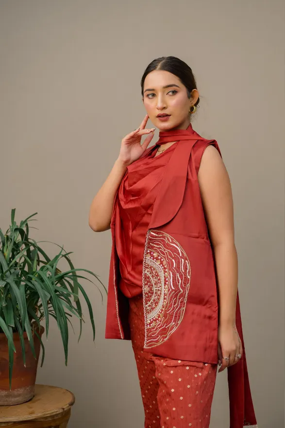 The outfit features a sleeveless satin top with a waterfall neckline, creating flowing, feminine lines. Paired with it is a sleeveless satin blazer adorned with intricate embroidery, styled with a modern dupatta featuring embroidered panels and latkan embellishments. The look is completed with chiffon pants showcasing inbuilt zari motifs.