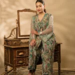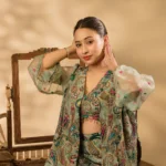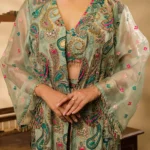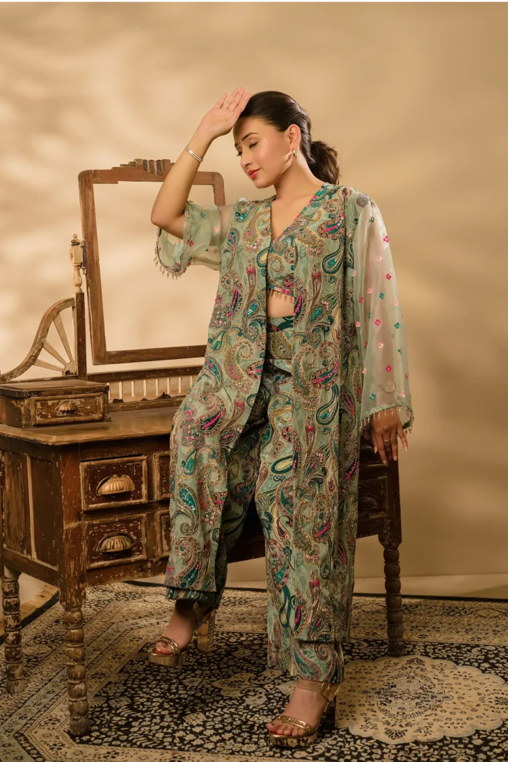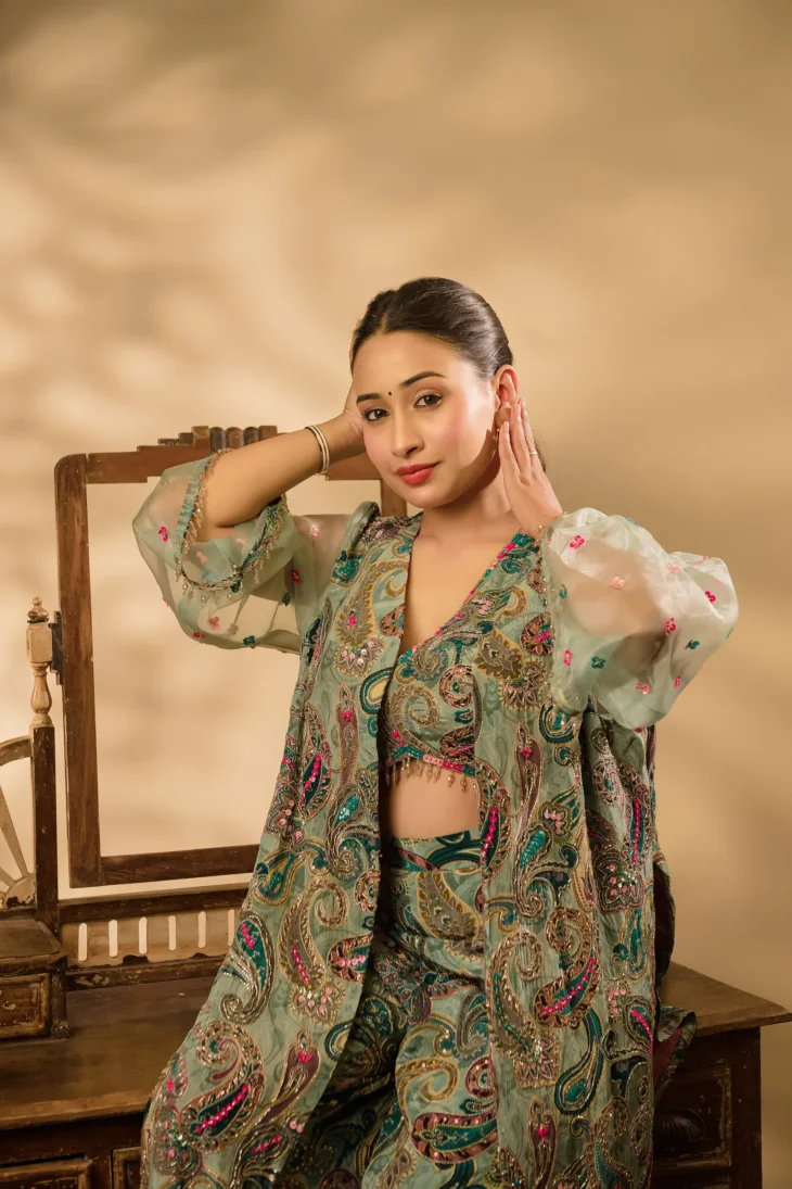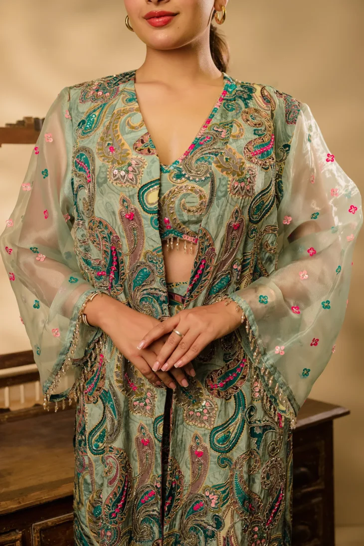 • Detailing: The shrug, bustier, and sleeves are adorned with exquisite embroidery in a unique modern style, incorporating sequins, kadhana, and zari work. The bustier and sleeves are further enhanced with perfect crystal embellishments along the edges, lending a premium look. The same intricate embroidery extends to the bustier, featuring a deep V-neckline that adds elegance and sophistication. The paisley print is enriched with delicate floral motifs and metallic highlights, creating a rich, satin-touch texture.