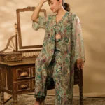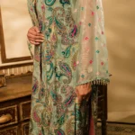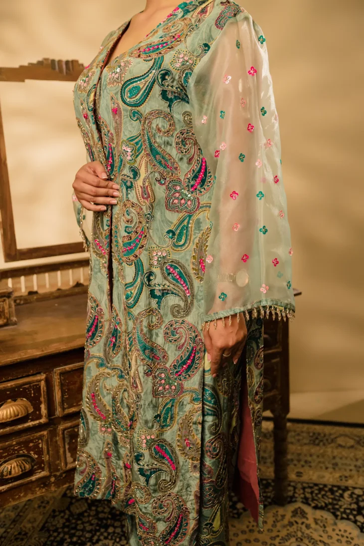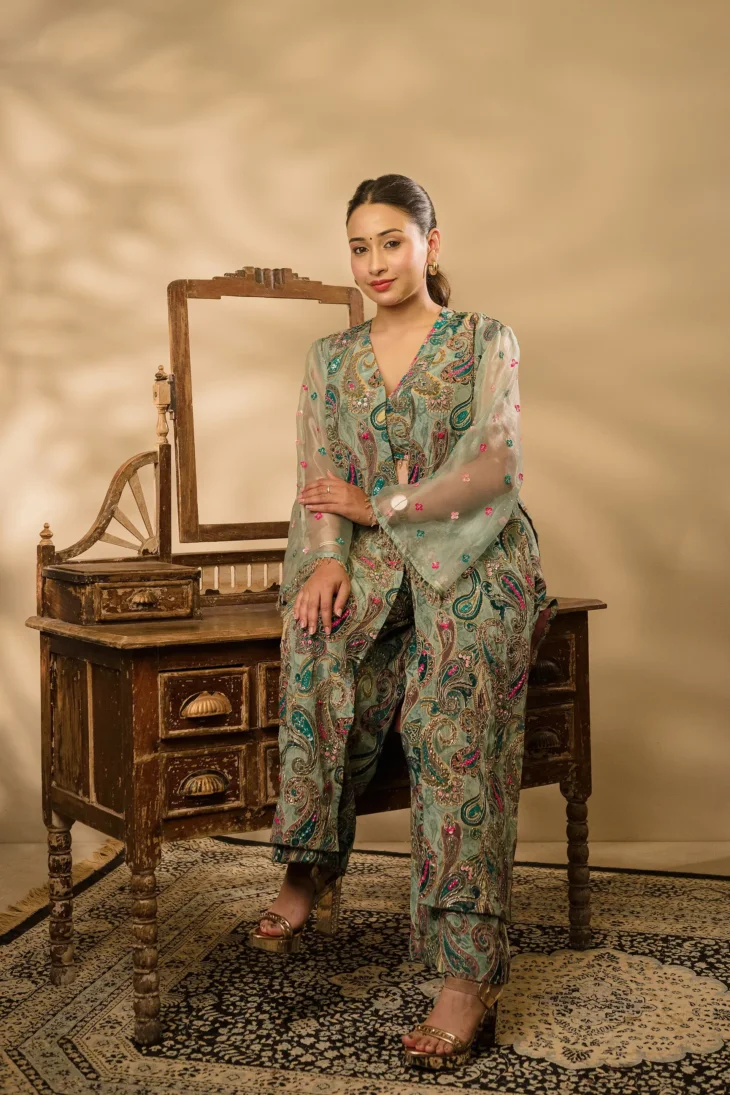 • Colour: A luxurious blend of soft sage green, teal, and pinkish-red shades, featuring an intricate paisley print with modern accents