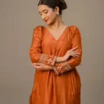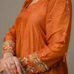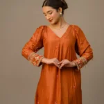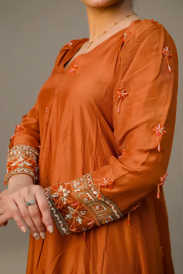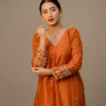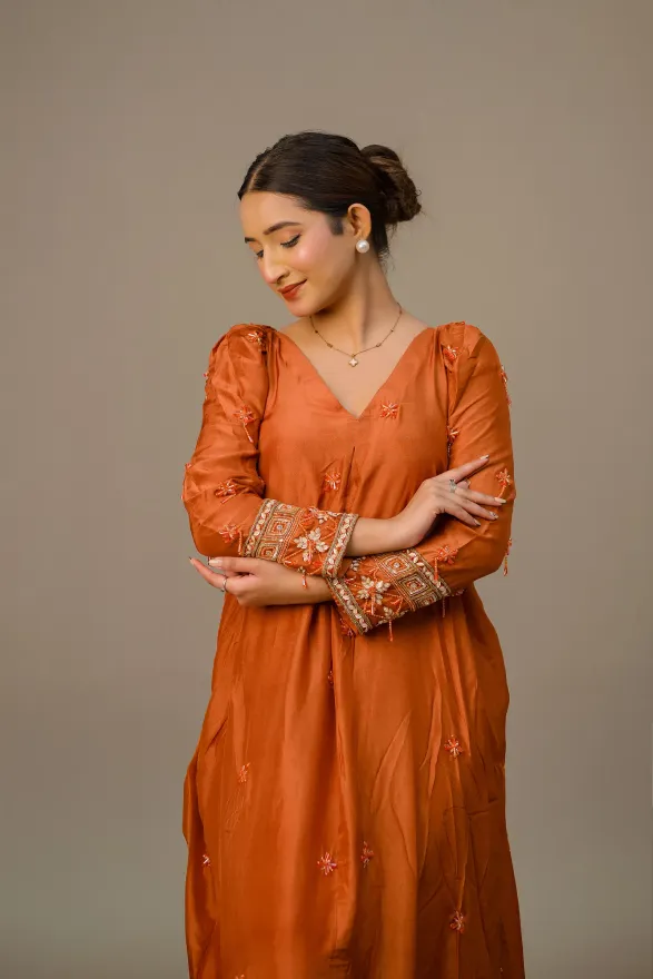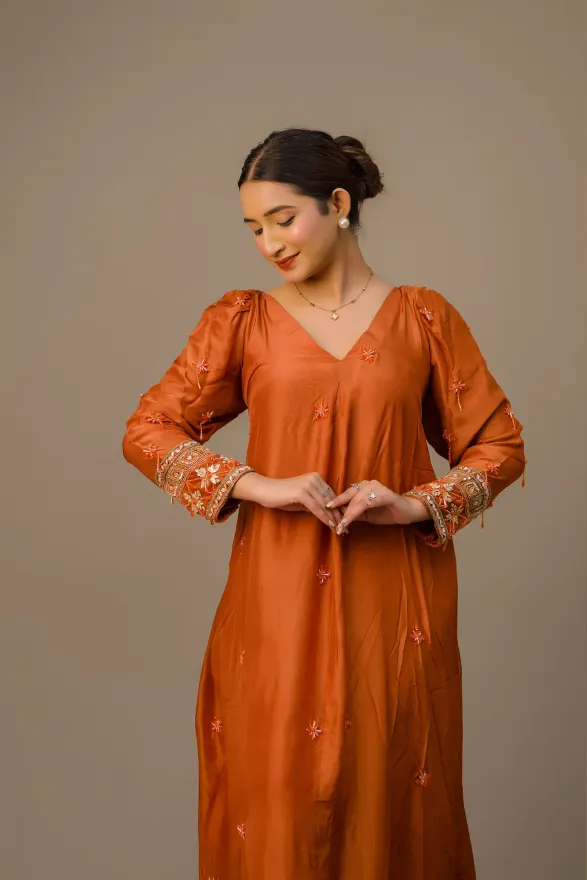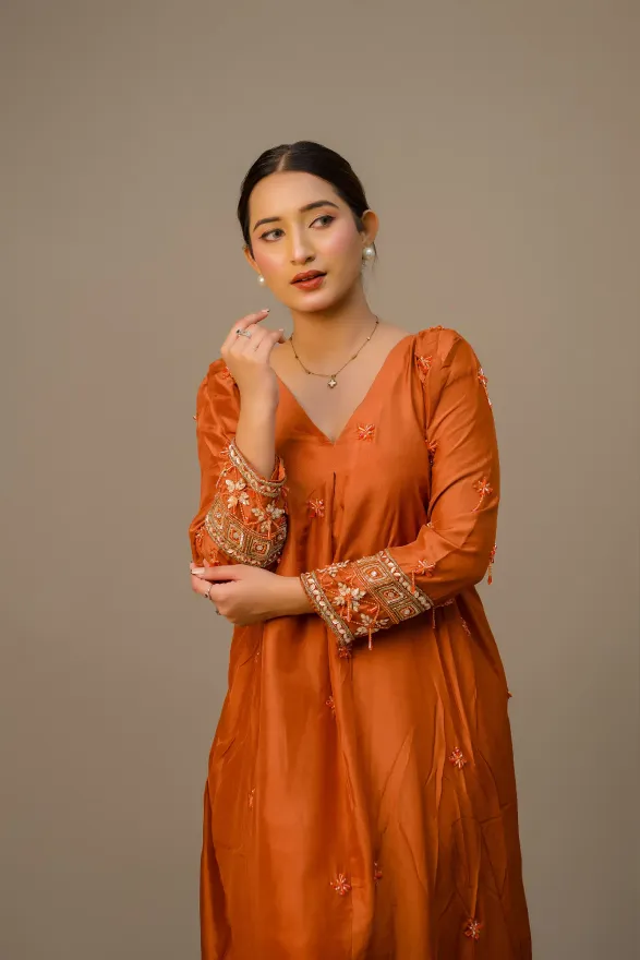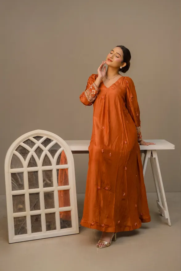 This silk dress embodies understated elegance with its fluid drape and lustrous sheen. The rich earthy tone is elevated with delicate embroidery details, adding depth and charm to its design. Soft yet regal, it strikes the perfect balance between comfort and sophistication. A timeless silhouette crafted for graceful evenings and special moments.