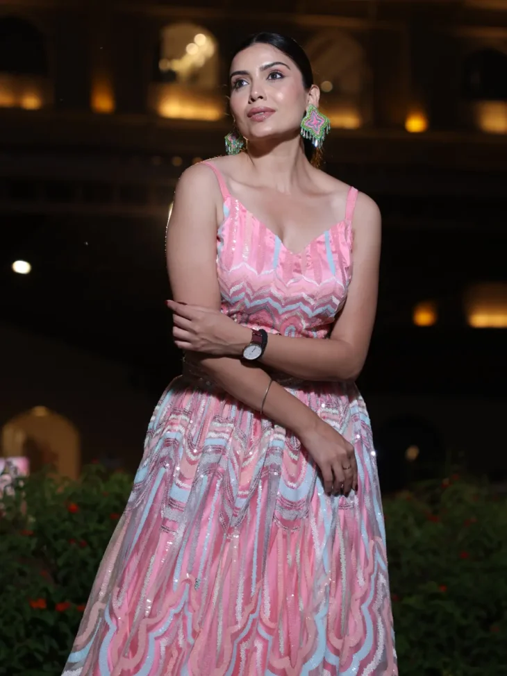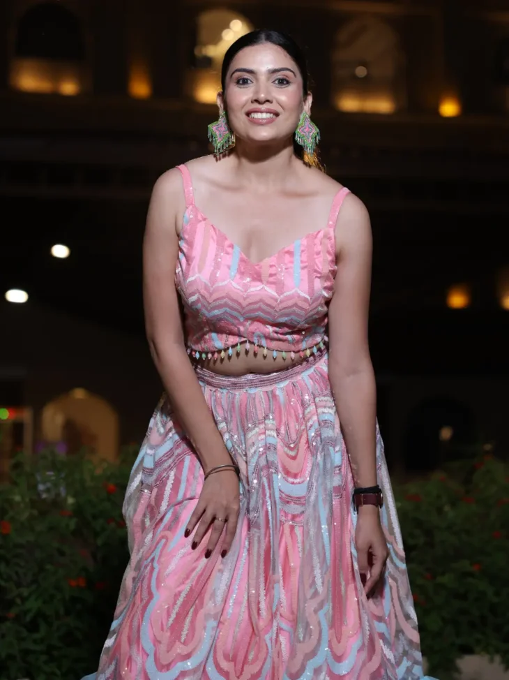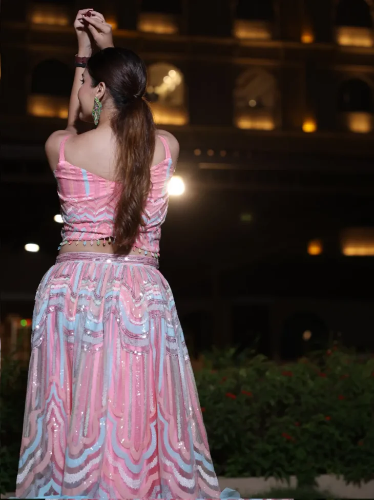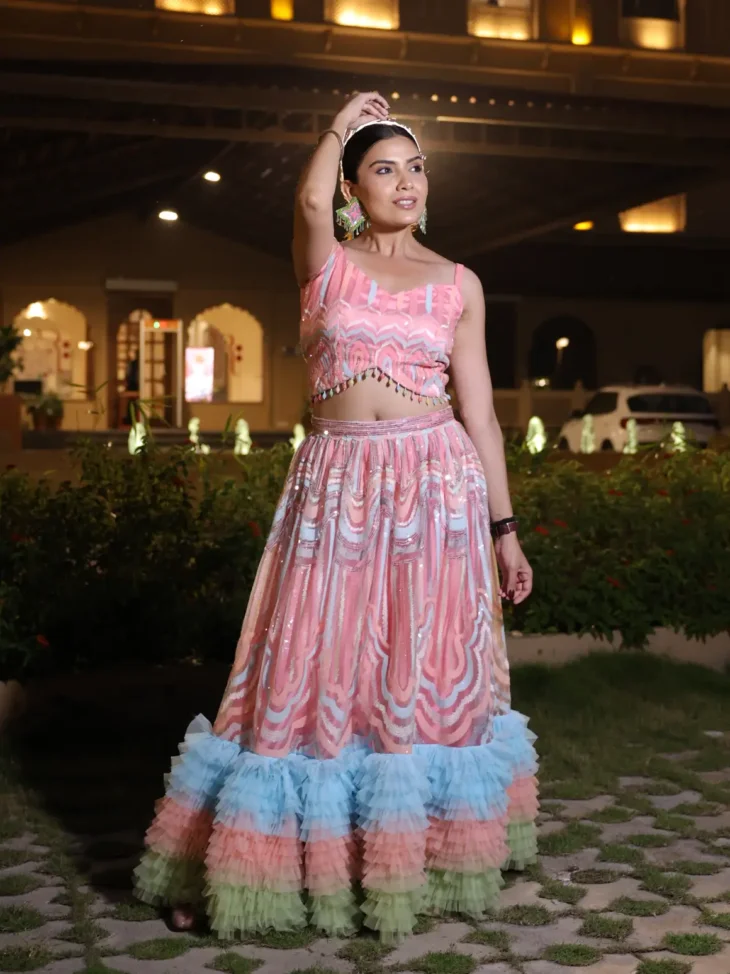 • Floor-length lehenga with net sequin work and a tri-color (pink, blue, green) hard net ruffled hem